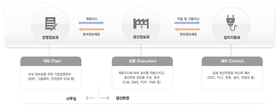 생산현장에서 정보기술 (IT)을 접목하여 생산공정의 불합리 요소제거, 생산관리 효율화 도모 및 시장변화에 능동적으로 대처할 수 있는 생산현장의 정보화시스템 구축